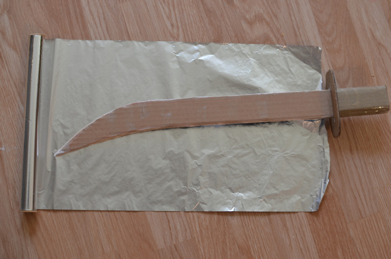 | Teraz nasleduje finálna fáza - prilepenie alobalu na čepeľ. Chce to trocha trpezlivosti a snahy, ale vďaka alobalu bude meč takmer reálne. |